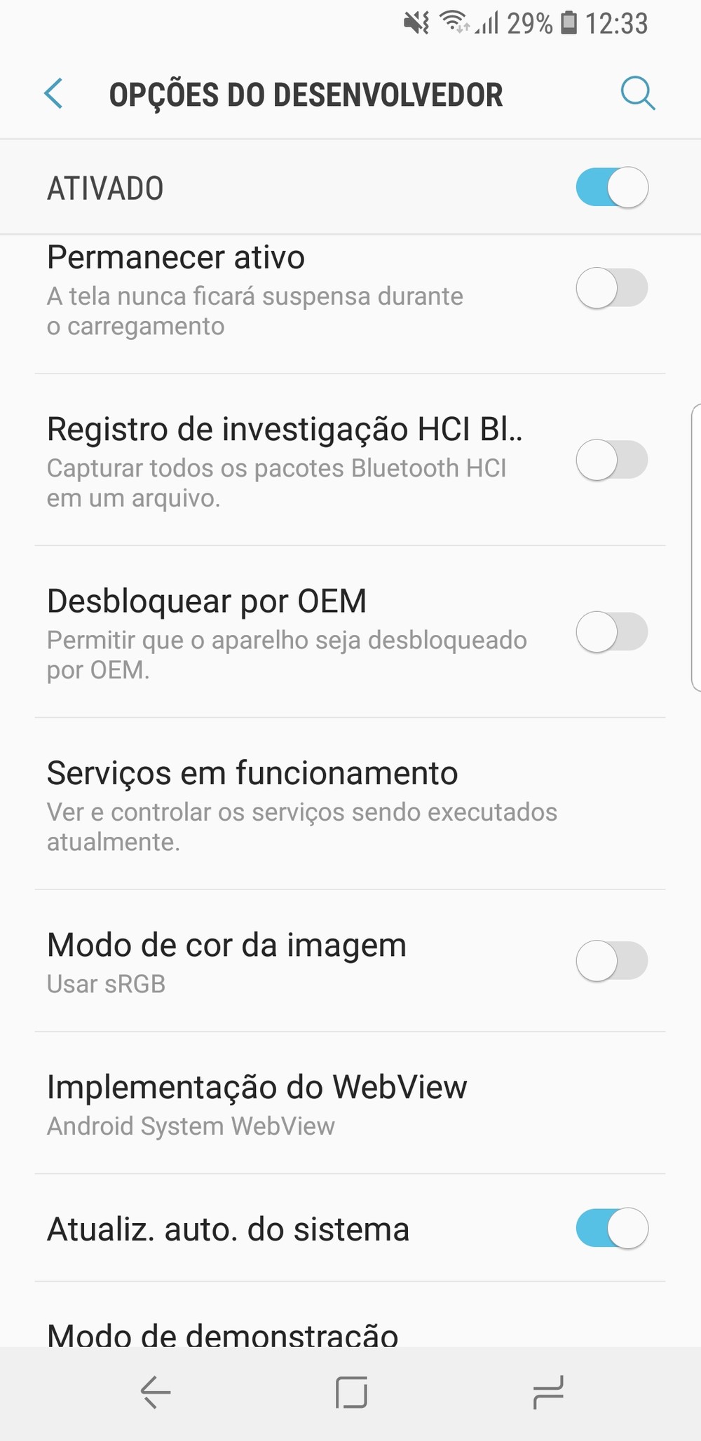 Antes de seguir com o tutorial, é preciso liberar o bootloader do seu Galaxy S8. Para isso, vá até a opção Sobre o telefone > Informações do software e toque 7 vezes no número de compilação. Será exibida uma mensagem informando que o ‘modo desenvolvedor’ está liberado. Volte a tela duas vezes e acesse Opções do Desenvolvedor.