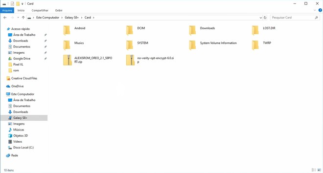Copie os arquivos para o cartão microSD do seu Galaxy S8. É importante que a ROM e o zip que desabilita a encriptação estejam na memória externa, pois iremos formatar a memória interna na hora de configurar o TWRP. É importante saber que os arquivos passados pelo recovery são sempre em formato .zip. Nunca descompacte a ROM ou qualquer outra modificação que você pretenda instalar em seu smartphone.