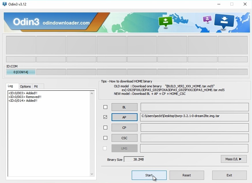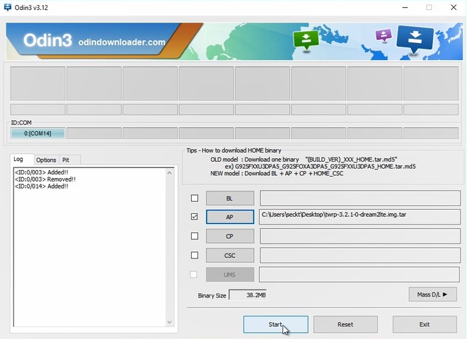 No ODIN temos quatro slots do lado direito: BL, AP, CP e CSC. Você enviará o arquivo do TWRP pelo slot AP. Basta clicar no botão respectivo e selecionar o arquivo .tar que você baixou. Tenha muito cuidado para não escolher o slot errado. Além disso, o arquivo do TWRP é diferente para cada modelo do Galaxy S8. Tenha certeza que fez download da versão compatível com seu aparelho.