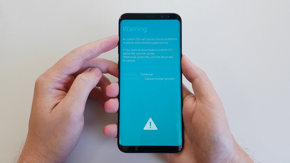 Agora com o desbloqueio por OEM ativado em seu celular, basta desligar o aparelho para entrar no modo de recuperação. Para isso, após o aparelho estar desligado segure os botões ‘volume menos + Bixby + power’ para entrar neste modo. Uma tela verde emite um alerta de segurança. Você precisa apertar ‘volume mais’ para confirmar que pretende realizar modificações em seu Galaxy S8.